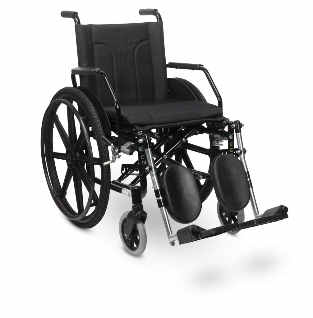 Fabricada em aço carbono, pintura epóxi, dobrável em x, duplo x, assento/encosto em nylon almofadado, acompanha almofada, apoio para braços escamoteavel, apoio para os pés com elevação de panturrilha e regulagem de altura, freios bilaterais, aro impulsor bilateral, rodas dianteiras aro 06″ com pneus maciços e rodas traseiras aro 24″ com pneus infláveis.
